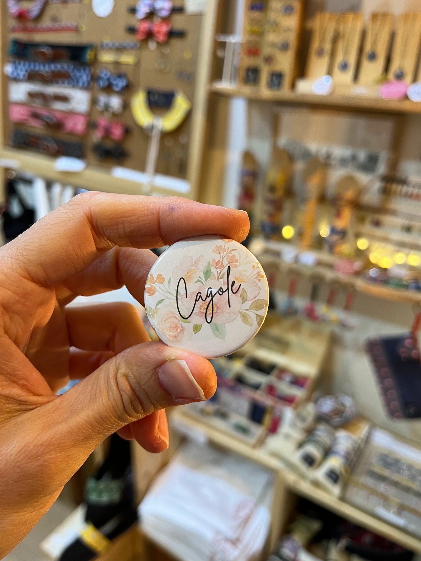 Broche ronde blanche visuel Cagole fleuri made in Aix-en-Provence.