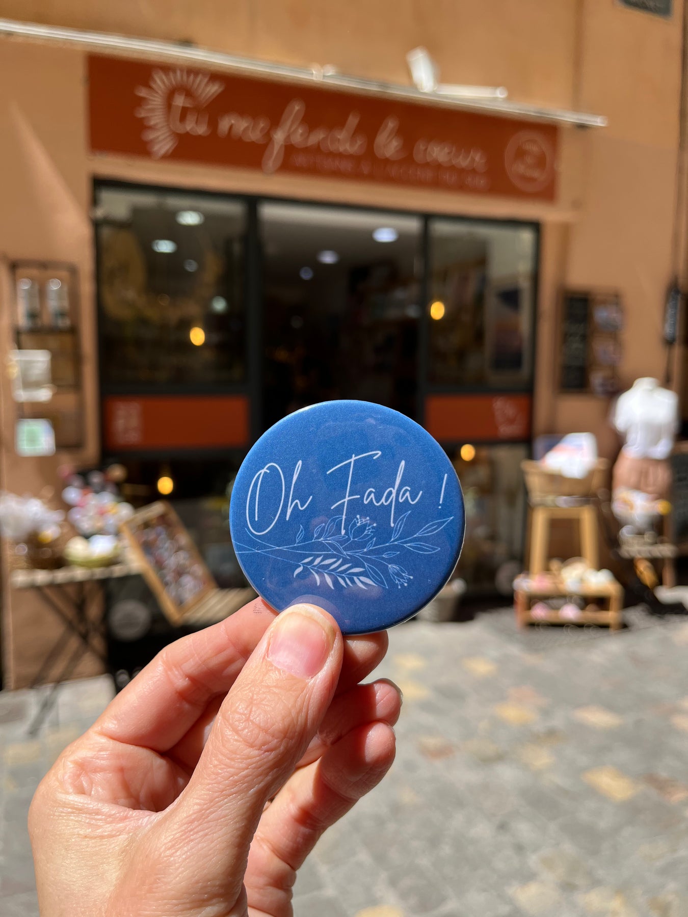 Broche ronde bleue Oh Fada ! fleurie made in Aix-en-Provence
