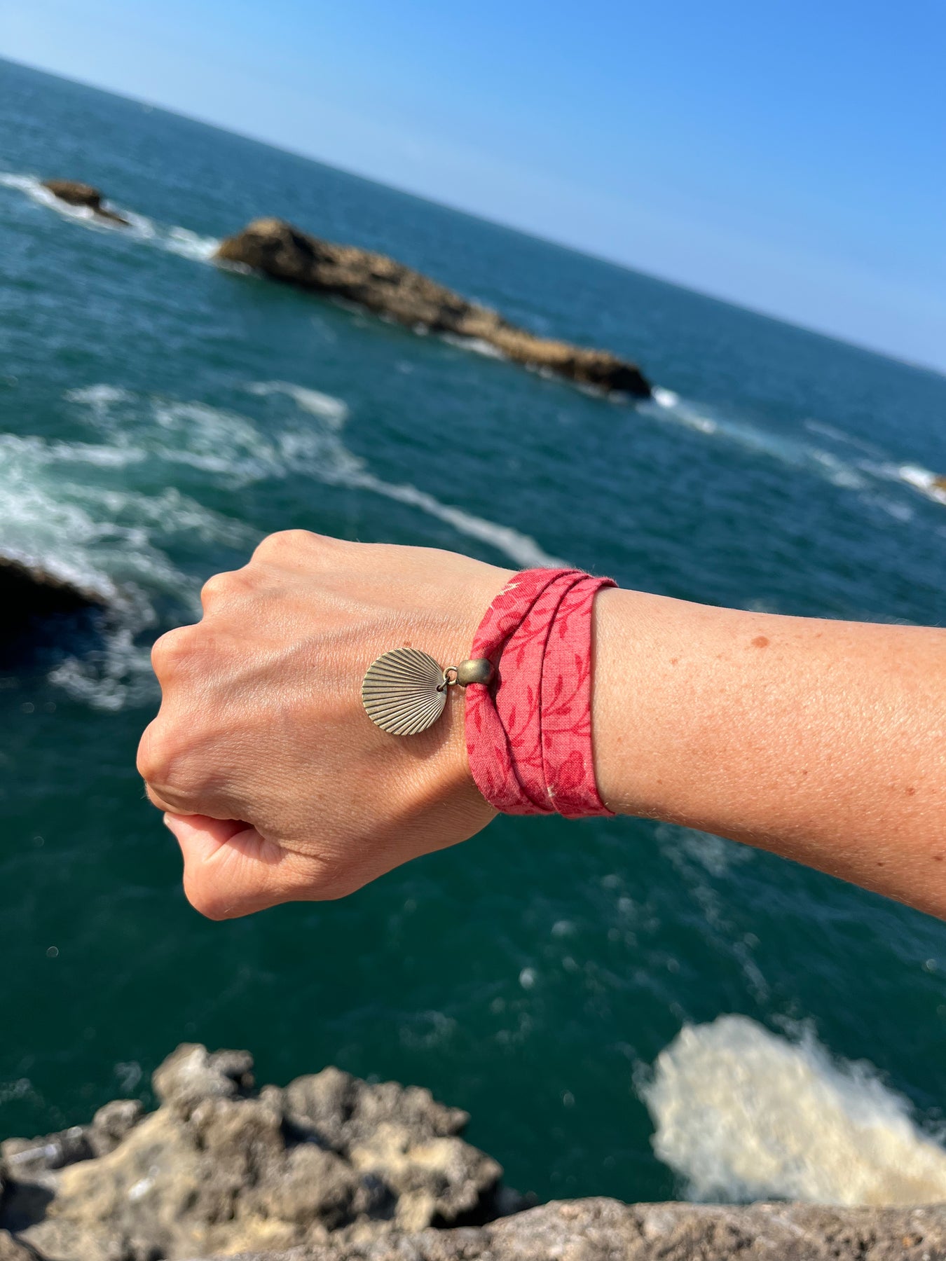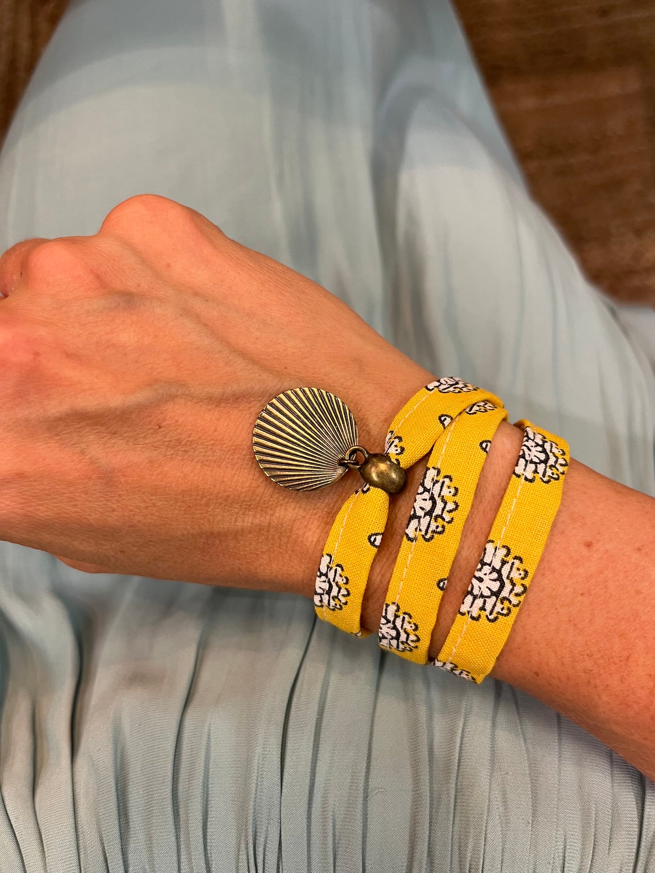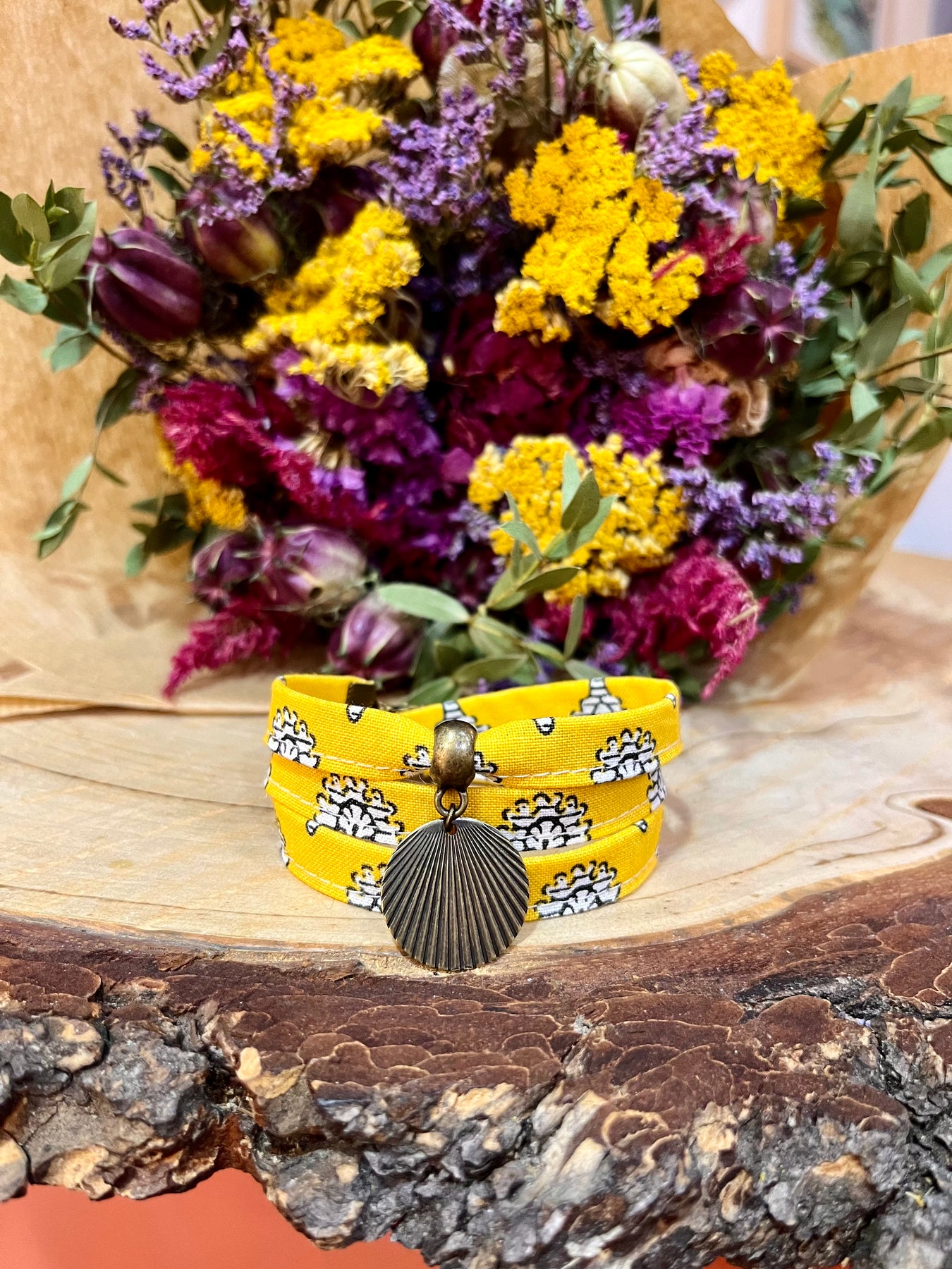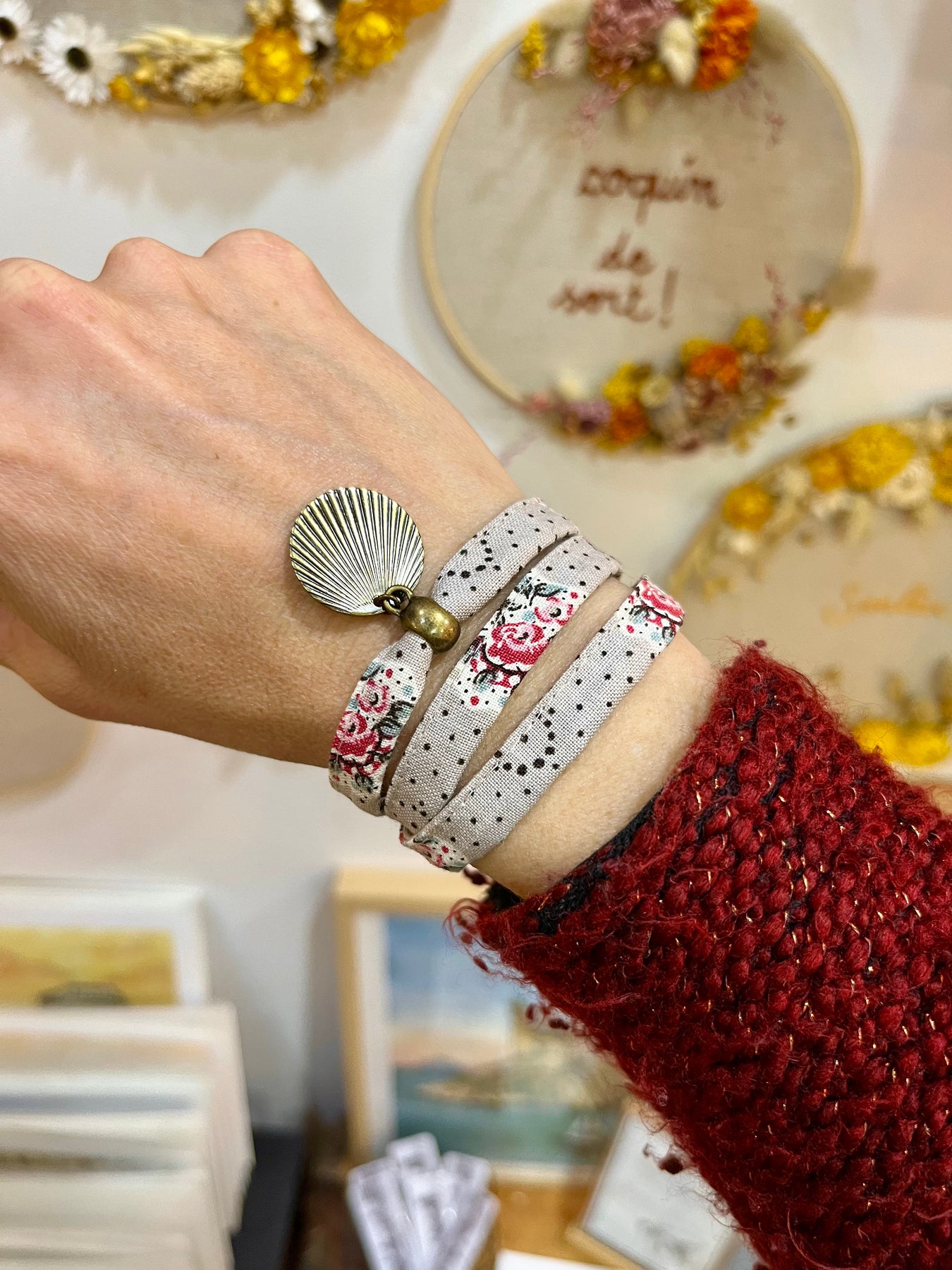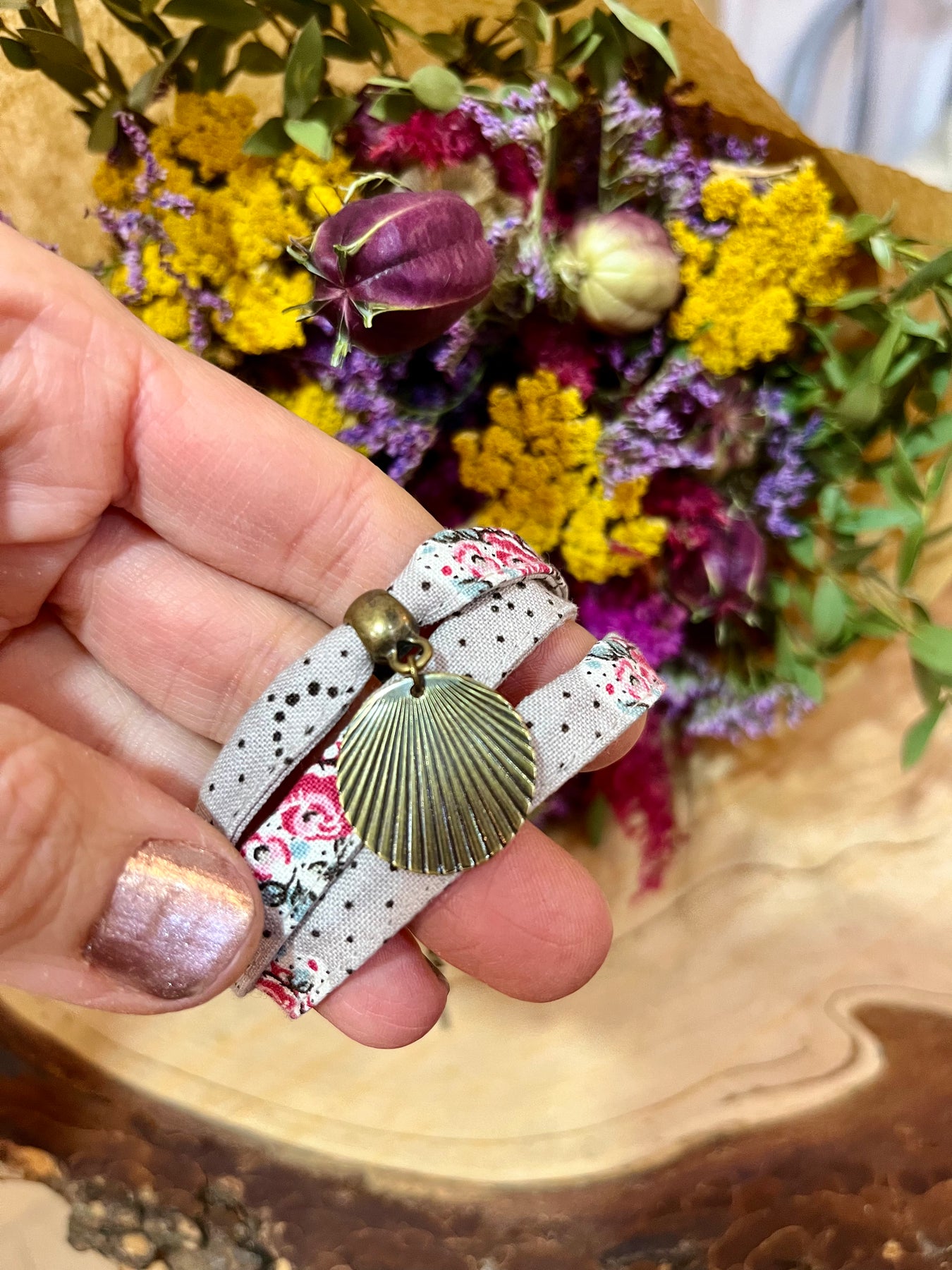 Bracelet multi tours tissu provençal pendentif rond gravé style éventail.